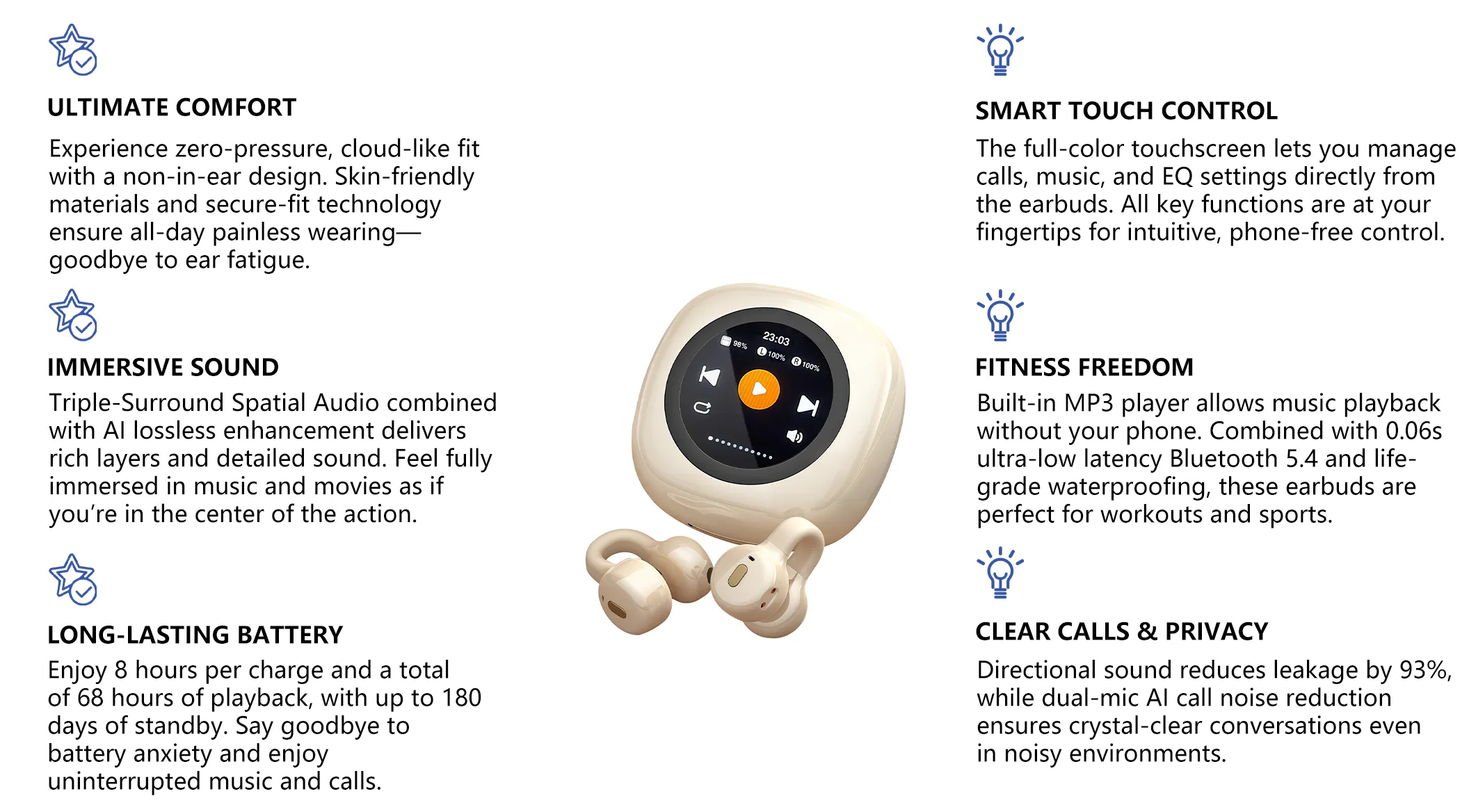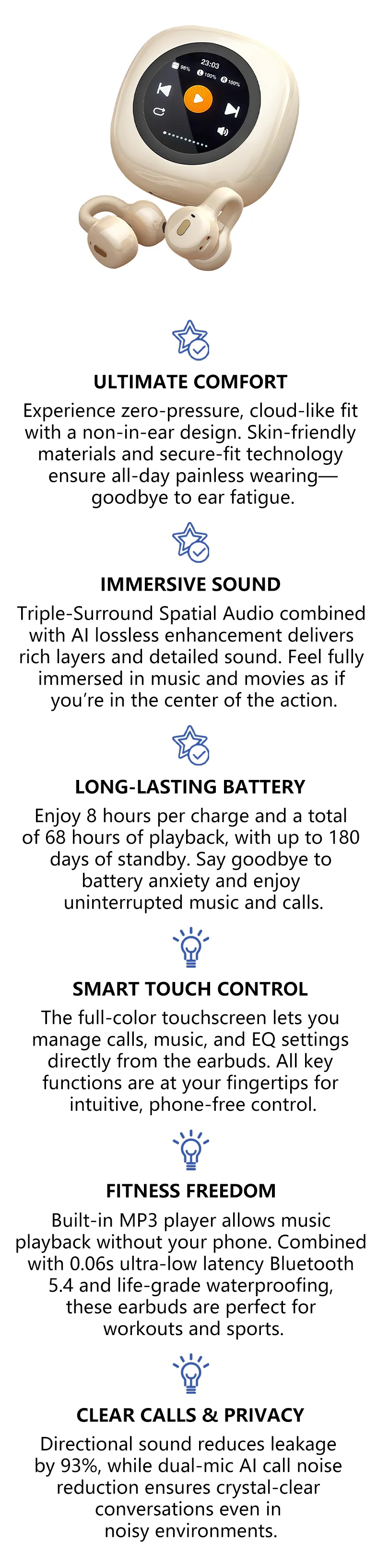 Ironis clip-on wireless earbuds feature an innovative non-in-ear design, complemented by a "Zero-Gravity Cloud-Feel" lightweight body. They clip gently onto your outer ear without invading the ear canal, allowing your ears to breathe. Combined with SFE Ear-Conforming Technology, we ensure a secure, stay-put fit alongside a cloud-like, skin-friendly wearing experience.