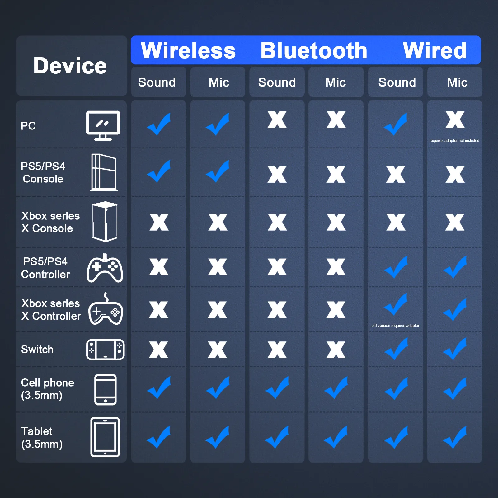 The Ironis Wireless Gaming Headset is designed for effortless compatibility with a wide range of devices, including PlayStation 4/5, Xbox (adapter required), PC and mobile devices. Enjoy a plug-and-play experience with no need for extra drivers or downloads, making it perfect for gaming anytime, anywhere.